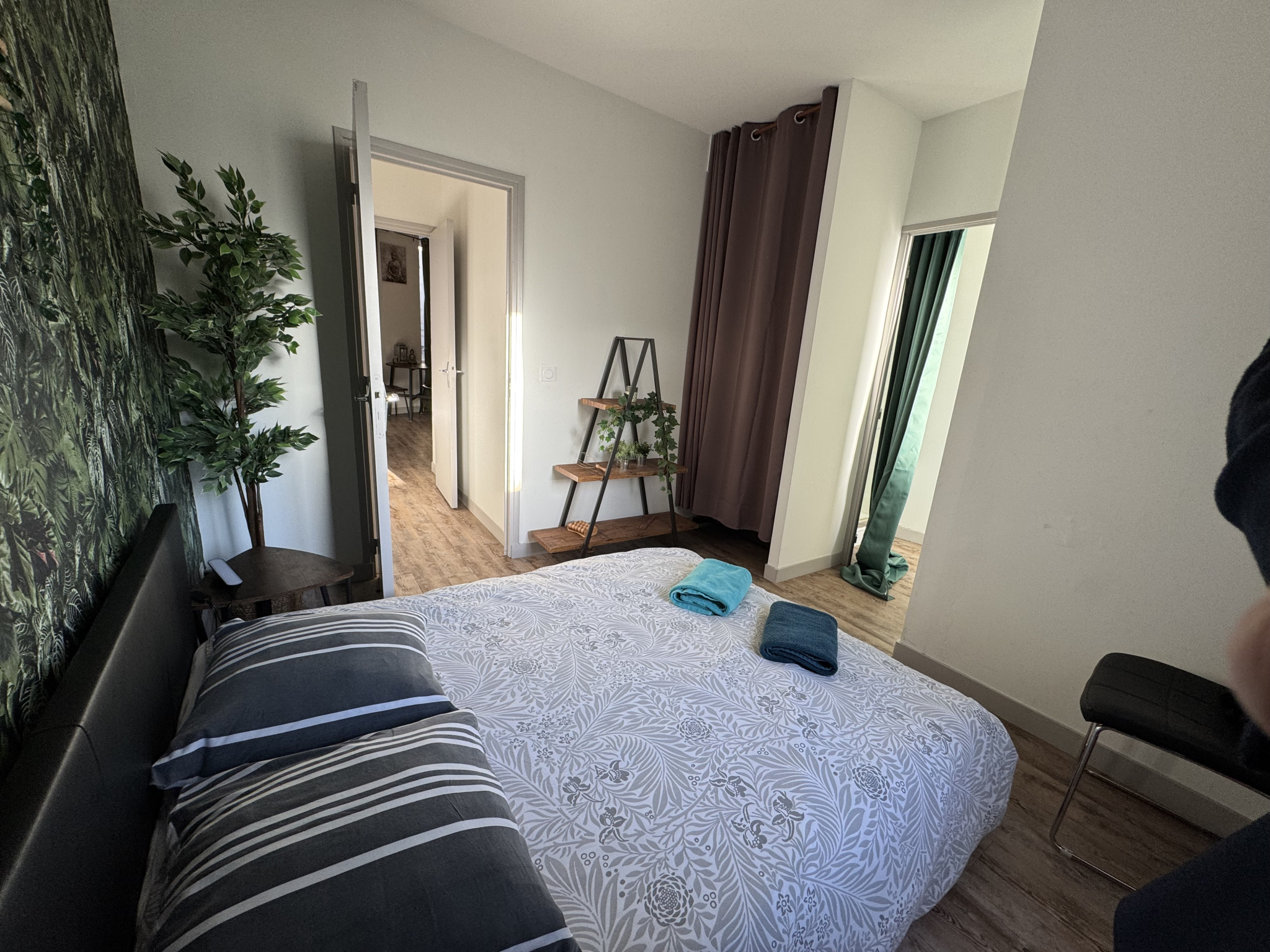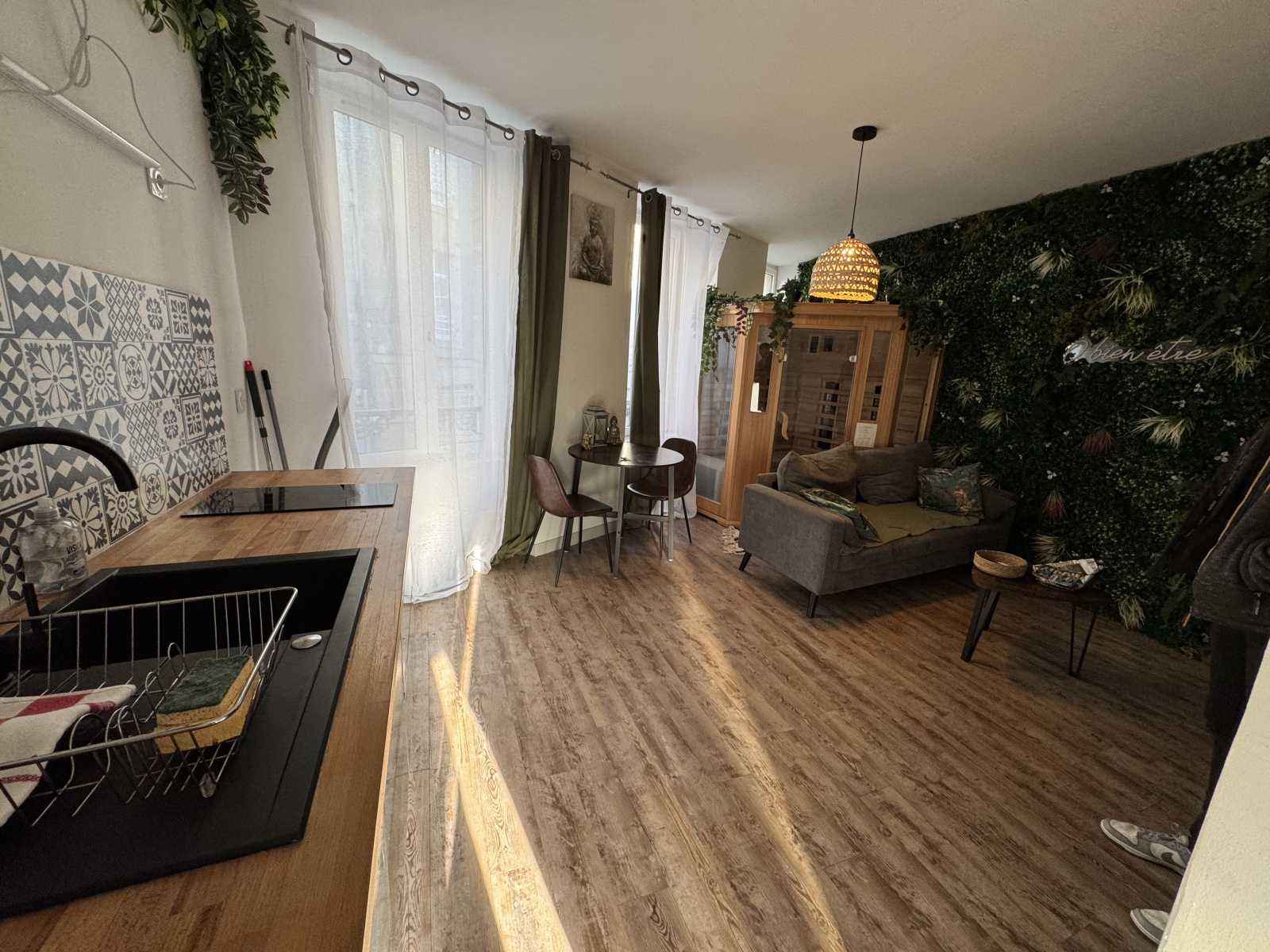 Au 1er étage, un T2 de 35 m² exploité en courte durée, sur un thème bien-être, générant en moyenne 1 000 € / mois brut (moyenne lissée depuis 2023).